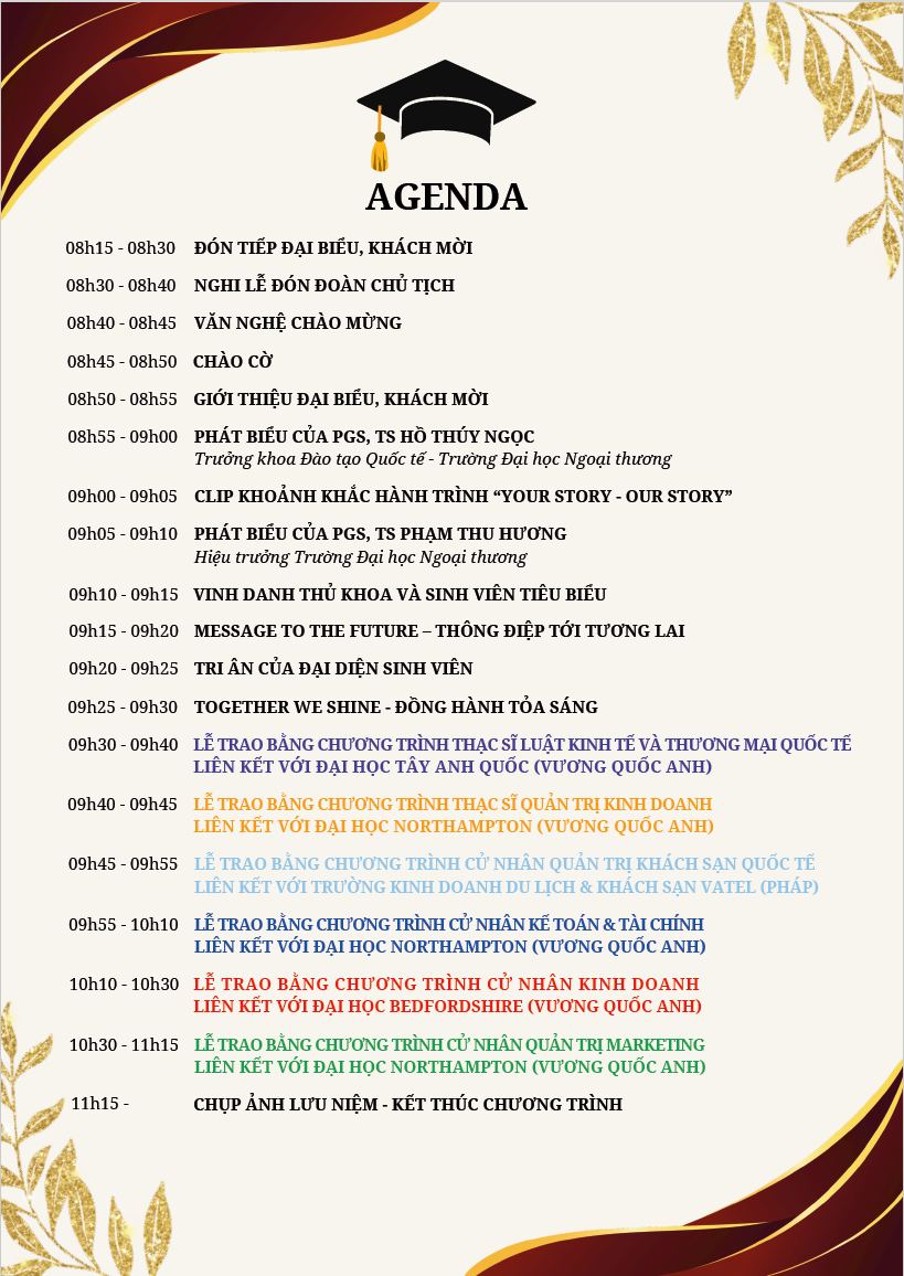 Khoa ĐTQT - FTU gửi đến các em Agenda chính thức và sơ đồ chỗ ngồi chi tiết cho Lễ Tốt nghiệp năm 2025 Đừng quên: Có mặt đúng giờ để check-in và ổn định chỗ ngồi nha Ghi nhớ khu vực dành riêng cho từng chương trình, sinh viên, phụ huynh và khách mời Và tất nhiên, hãy mang theo nụ cười rạng rỡ nhất vì khoảnh khắc đặc biệt nhất đang đến gần rồi đó Mọi thông tin chi tiết khác, các em sẽ được GVCNL cập nhật thêm nhé! #KhoaĐTQTFTU#FOIEGraduation2025 #ClassOf2025