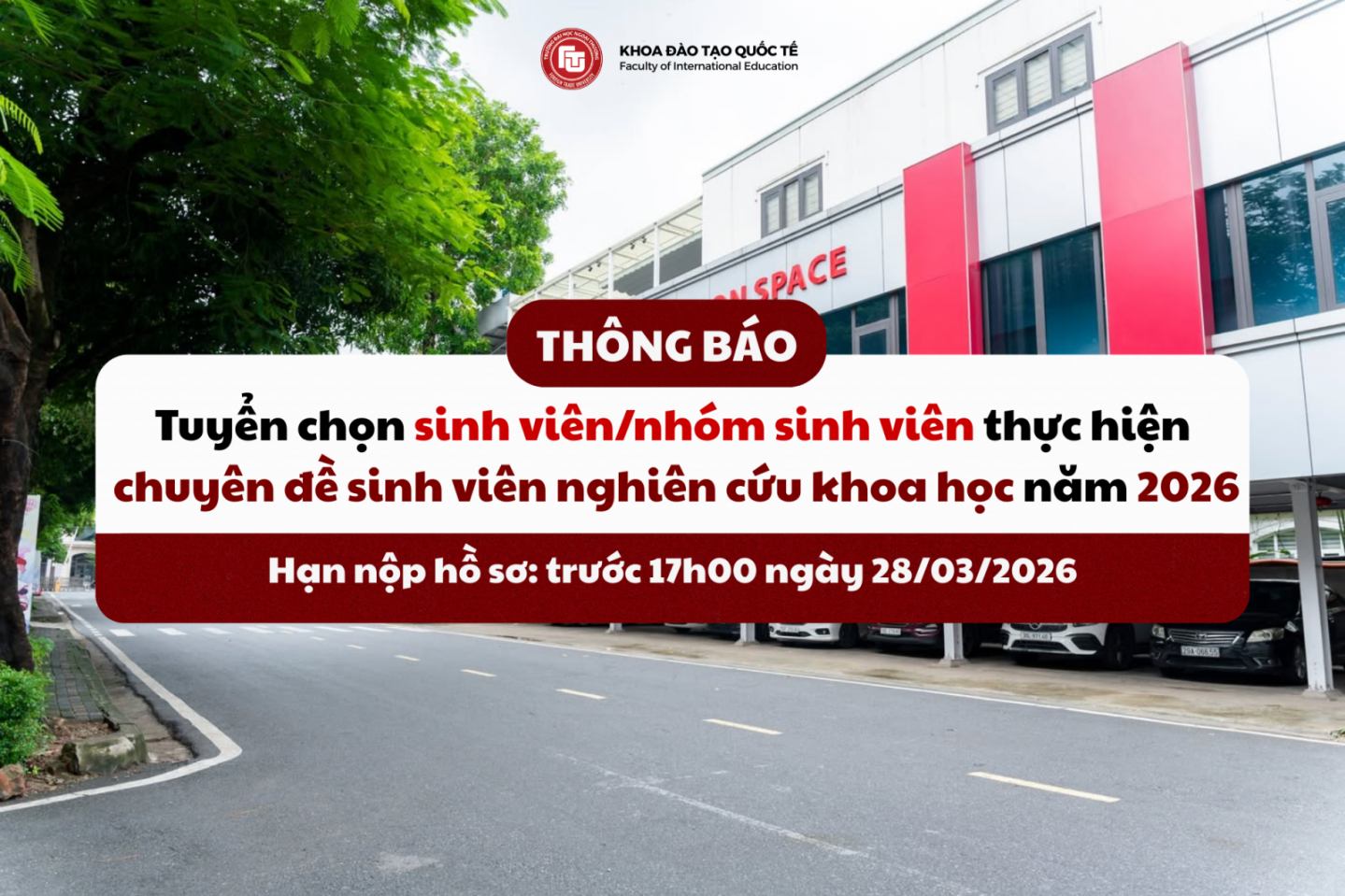 Thực hiện kế hoạch hoạt động nghiên cứu khoa học của sinh viên và Căn cứ quyết định số 484/QĐ-ĐHNT ngày 28/01/2026 về việc phê duyệt danh mục chuyên đề sinh viên nghiên cứu khoa học năm 2026 (Quyết định và danh mục kèm theo), Khoa Đào tạo Quốc tế xin gửi thông tin đến các em sinh viên của Khoa về việc tham gia tuyển chọn thực hiện các chuyên đề SV NCKH. Thông báo cụ thể như sau: