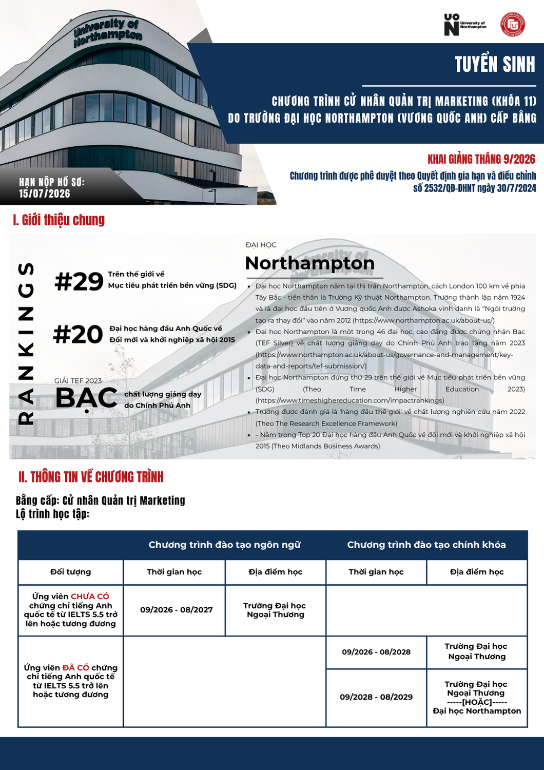 Văn phòng tuyển sinh 1: Phòng 1008, tầng 10 nhà A, 91 Chùa Láng, Đống Đa, Hà Nội